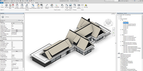 Voorbeeld van de technische uitwerking van een moderne villa in een BIM model. Dit staat voor Building Information Model. Vanuit dit model worden alle technische tekeningen gegenereerd en het model wordt gebruikt om gegevens uit te wisselen met ontwerp- en bouwteamleden.