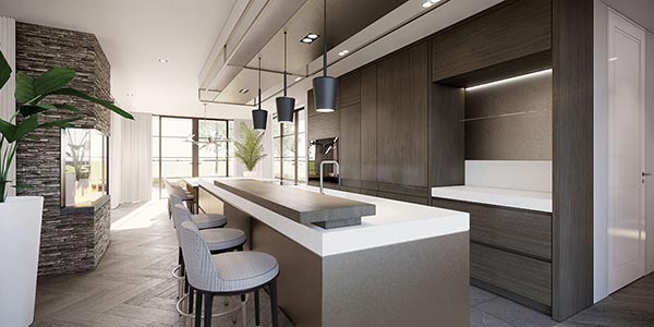 Voorbeeld van een afbeelding uit het VR model van het interieur van de bovenstaande moderne villa. Als opdrachtgever kun je op deze manier virtueel door de villa lopen en alle ruimten ervaren.