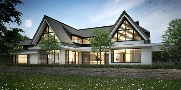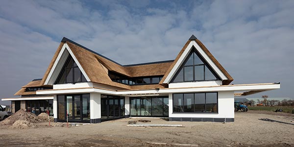 Voorbeeld van een visualisatie van het ontwerp van een moderne rietgedekte villa. Op deze manier kunnen we goed laten zien hoe de woning eruit komt te zien en kunnen we varianten maken om de uiteindelijke materialen te bepalen. Met Virtual Reality (VR) kunnen we het gebouw rondom bekijken om een goed totaalbeeld te krijgen
